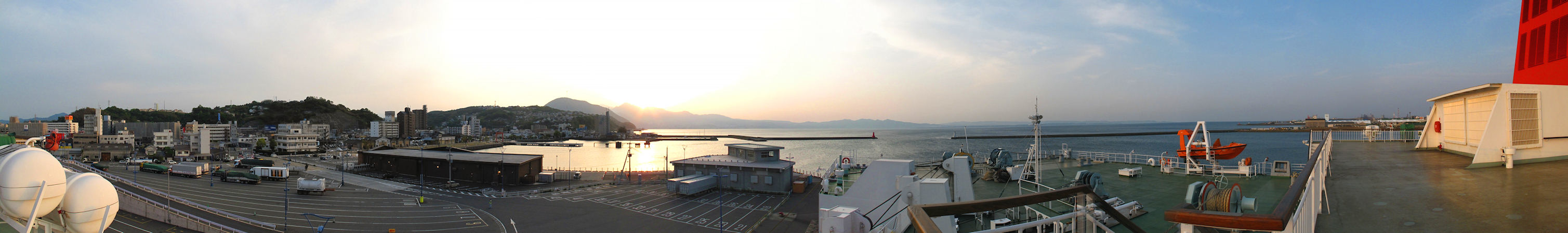 2011年5月19日 西大分港のフェリー(さんふらわあゴールド)デッキから別府の山に沈みゆく夕陽を眺める。