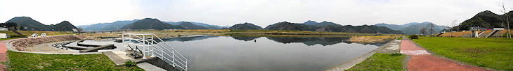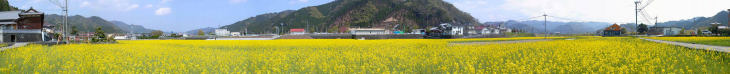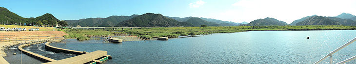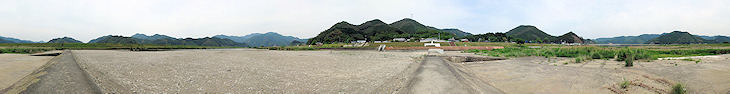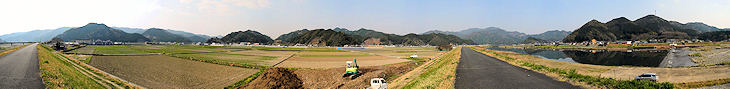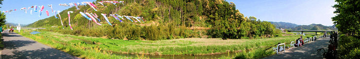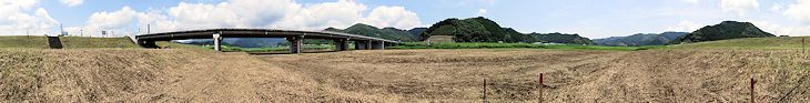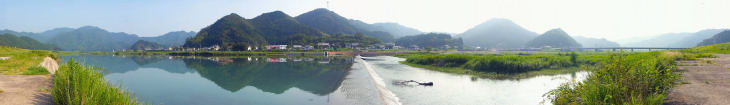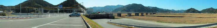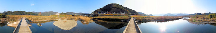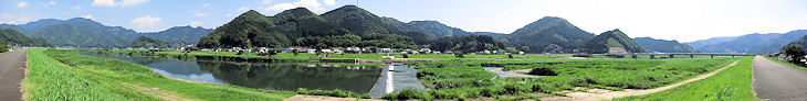 弥生の番匠川と道の駅やよい周辺のパノラマ風景写真
