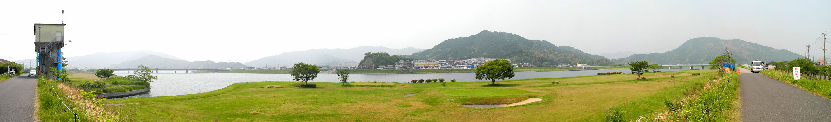 水門近くの堤防から河川敷ゴルフ場を眺める