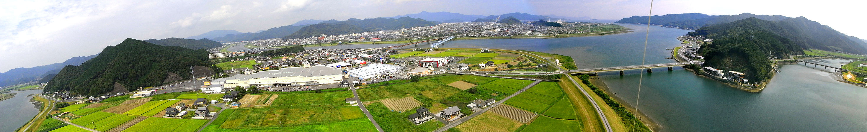 2009年9月14日撮影 このパノラマ写真は凧にぶら下げたデジカメを回転させ5枚の写真から作成しました。 高さは推定40m〜50mかな。 斜めに傾いた写真が殆どで なかなかパノラマ合成できる写真は撮れません。 カメラを地上の風景をたくさんいれようと若干下向きに取り付けてまわしたので合成に無理がありますがとても面白い 鳥の目で見た佐伯市です。