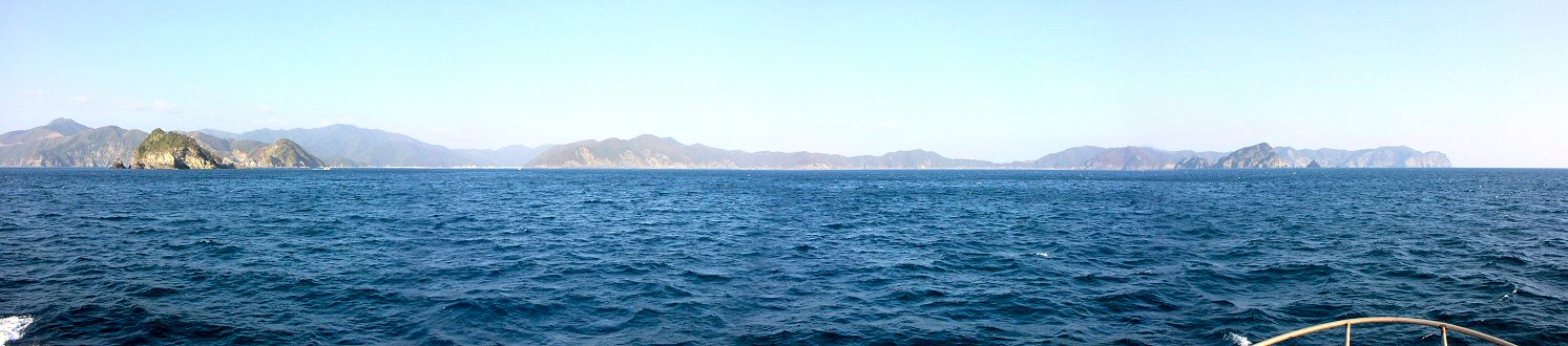 沖の黒島のさらに沖から撮影した米水津湾と右に長く伸びたつるみ半島