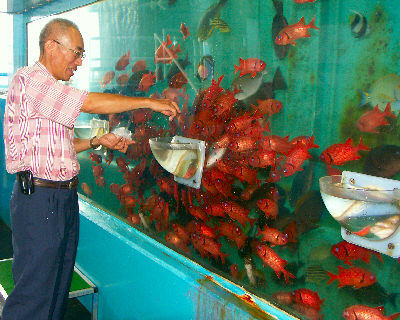 魚に直接餌をやれる不思議な水槽 水があふれ出ないのは何故?