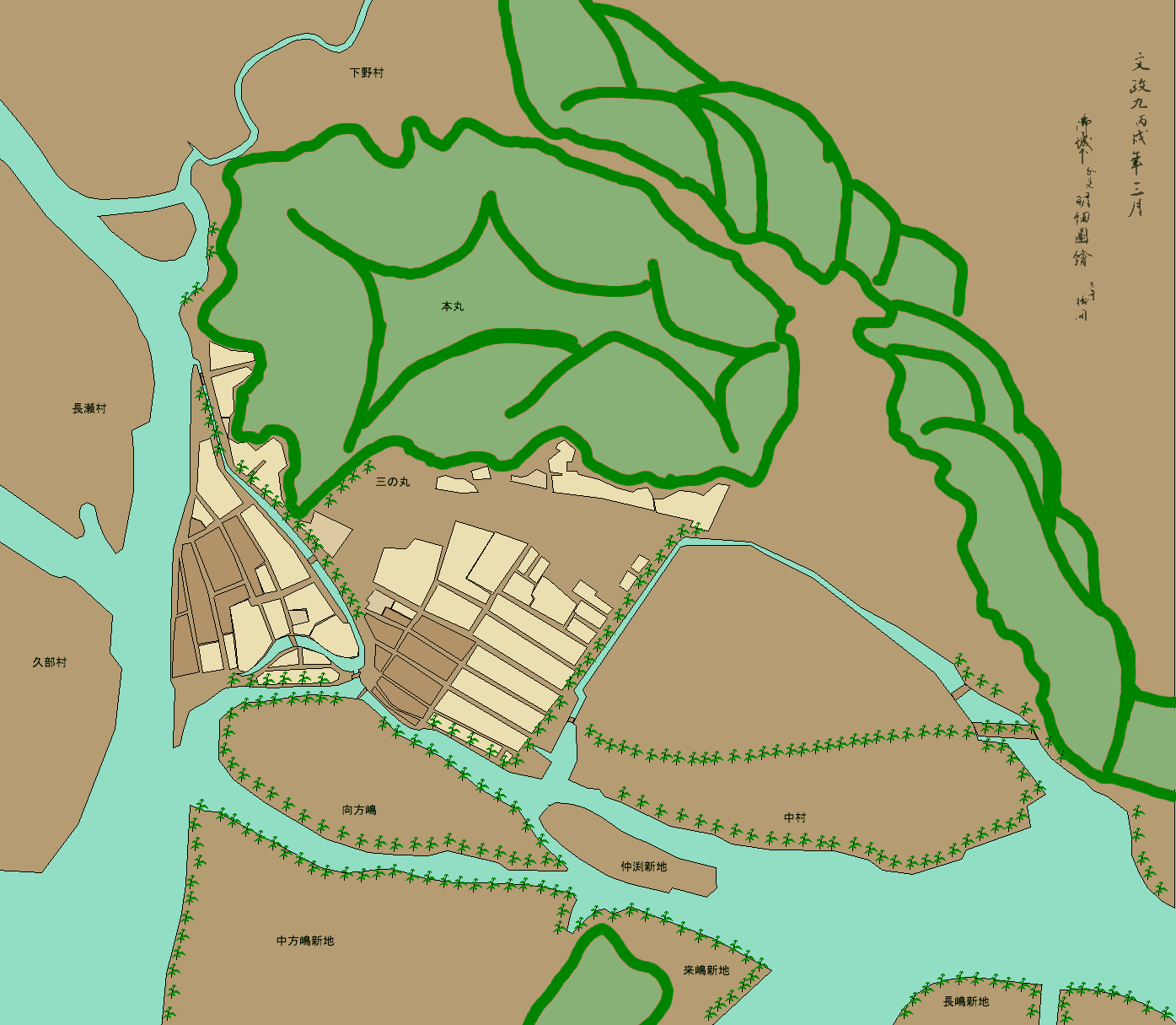緑の小さな・印は松の木です 明治時代の城山からの写真に中村の松並木が写っています
