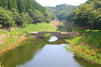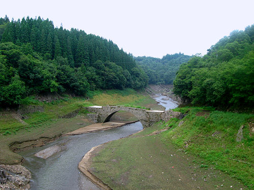 ここは北川ダム上流で この画面一番右の石橋は明治41年に完成した石橋です 普段はダムの湖底に沈んでいるはずですが 最近雨が少なく 昔の田代橋が湖面に出ています 立派な石橋です 2005年7月28日