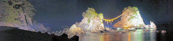 年末年始には、しめ縄で結ばれた雄岩と雌岩がライトアップされ、神秘的で幻想的な風景を演出します。
