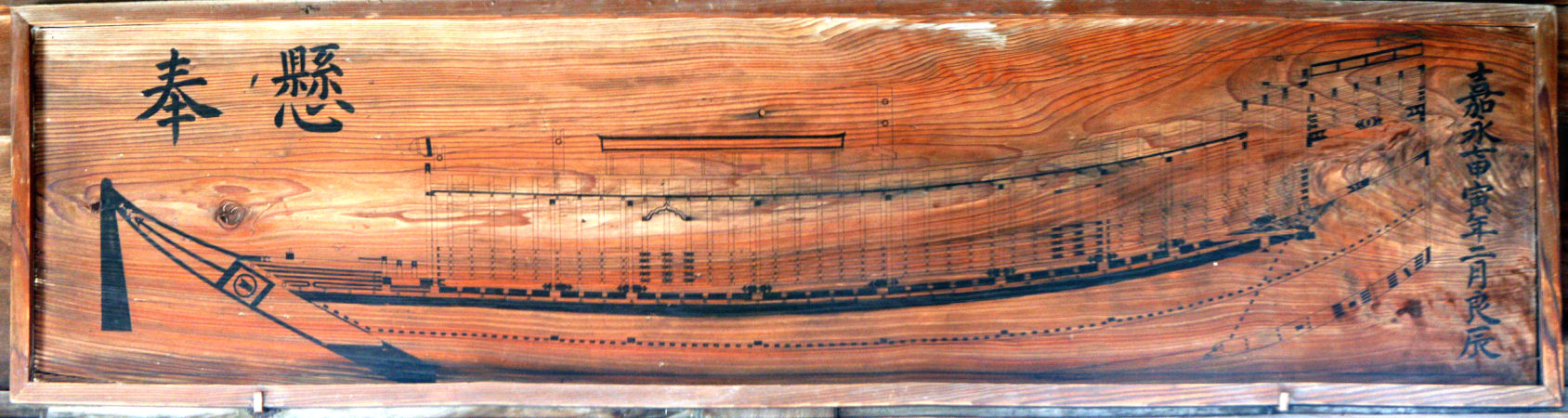 下の船絵馬は細川藩の波奈之丸を中心に参勤交代に従う船団が鶴崎港に帰港している様子を