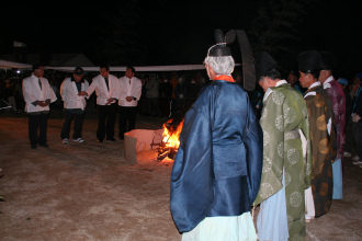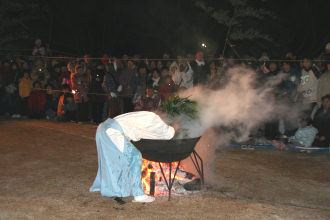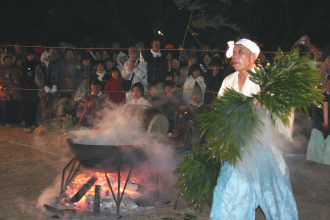 | 湯立て神楽 | 煮えたぎるお湯の中に向かって笹で湯を浴びます | |