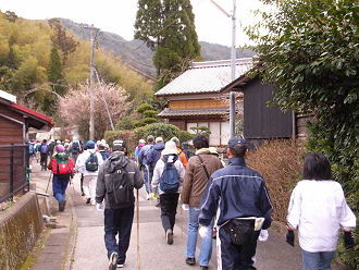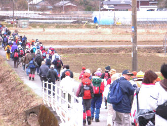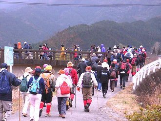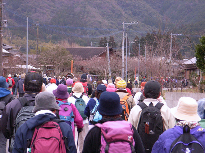 | 田舎の道に突然リュックを背負った登山者の行列が |