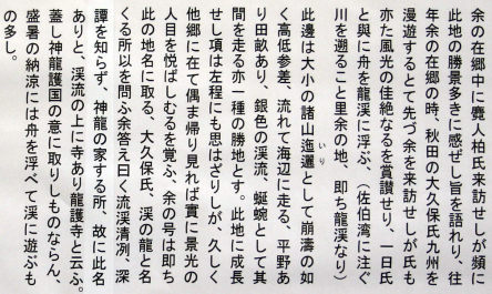 広瀬淡窓が若い頃 日田の地で淡窓の師であった松下筑院(四教堂)を慕って佐伯に来たとき この龍渓渕で船遊びした歌が「龍川船遊」 明治に活躍した矢野文雄(龍渓)の号 龍渓はこの龍渓渕からきています