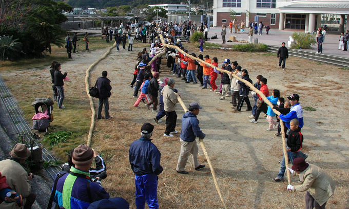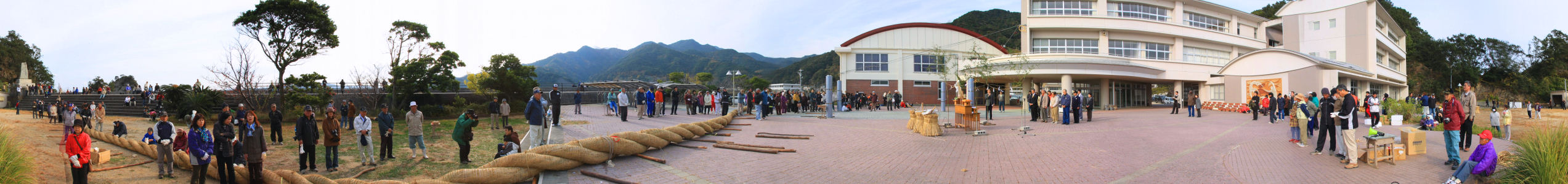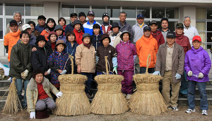 上浦町には田んぼがありません、しめ縄に適した餅米の稲藁を竹田市荻町の方達が毎年わらを持って来てくれます。 下は荻町のボランティア参加の方達の記念写真です。 長さ70mの3本の縄を捩ってしめ縄を作ります