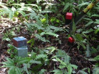 | 3 シダの生茂った中をマムシに注意しながら進みます | 4 ところどころに林業公社の調査ポイントがあります | |