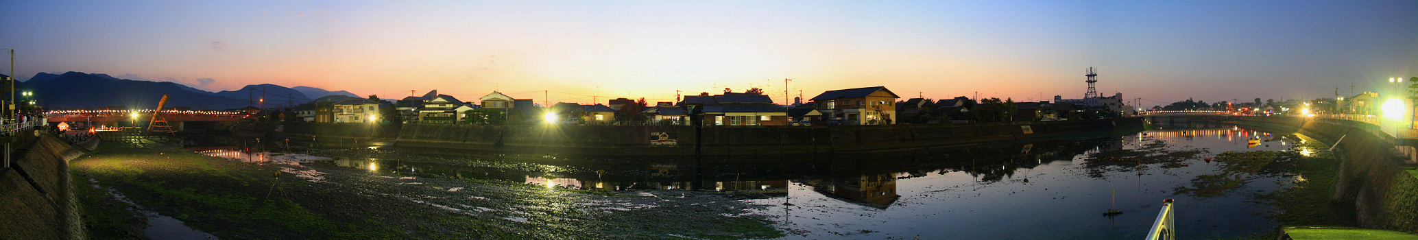 2008年11月14日 豊後高田の町も日が落ちてあたりが暗くなってきました。 今日は秋の大祭です 御玉橋にも提灯が灯ります。 これから2時間すれば満ちてきて神輿が川を渡れます。 引き潮の浅い状態だと重い神輿をかつぐので足が川底の砂利や小石で痛いそうです 川の深さが腰くらいになると川組の勇士(80人〜90人)が神輿をかついで川を渡ります。