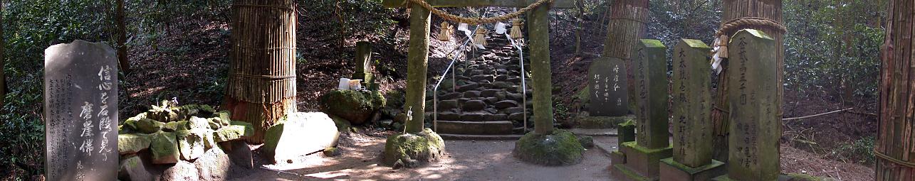 豊後高田市にある国指定史跡・重要文化財の熊野石仏には長い石段がある。昔、ここには鬼がいて、熊野権現に「田染の里の人を食いたい」と許しを求めた。権現は「それなら一夜で百段の石段を造れ。できれば食うのを許そう」という。鬼は力をつくし、あちこちから石を運んできては石段を築く。九十九段までできたところでこれでは人間が食われてしまうとあわてて権現が鶏の鳴き声をまねした。鬼は最後の石をになって立石というところまできていたが、鶏鳴とともに精魂つきて倒れてしまった。