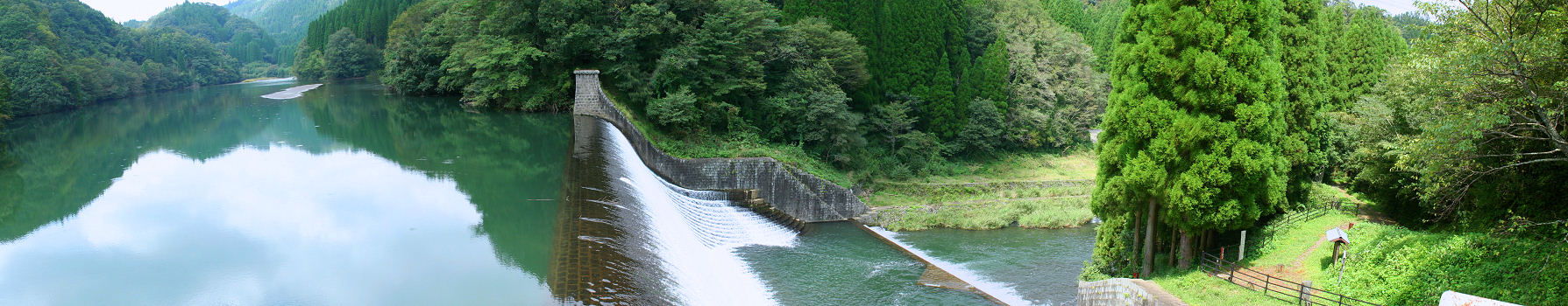 国指定重要文化財 昭和13年完成 ダム岩床の岩盤の弱さをカバーするため 緩やかなカーブ 階段状石積みなどで 水の落下スピードを弱めています 九重町の竜門の滝をヒントに作られた日本一美しい石造ダムです