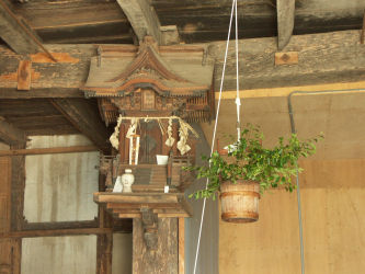 | 小手川酒造の古い立派な神棚 | 酒蔵 大きな瓶に年代別に保存されています |