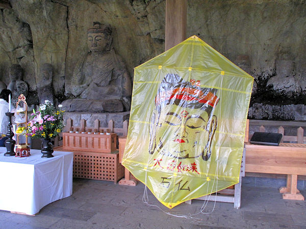 大日如来のお顔を描いた凧を自作し 本物の大日如来前で2010年9月28日凧の開眼です
