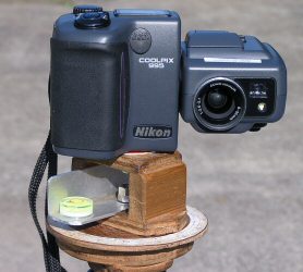 | 今ではオリンパスのデジカメ C-760 Ultra Zoom を2台 同じ板に並べて取り付けて 立体写真を撮影しています オリンパスの利点は パノラマモードがある事です この板をパノラマ架台に載せ 立体パノラマ写真を撮影 但し同時にシャッターを押すのは 結構難しいし カメラの個体差があります ズームは使用せずいつも 42oで撮影しています これだと360度全周撮影可能 丁度10枚で全周になります |