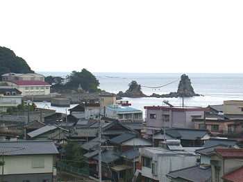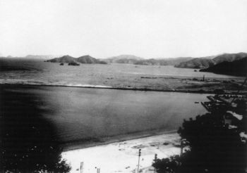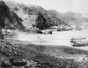 入津湾 今のパノラマ湾は大南に面せり神武天皇東征し給ふや途次舟師此所に泊す上陸し給ふの地をヱムト鼻と称す湾内水清く且つ深し中央に浅所あり俗称彌治郎貝を産す本郡の名物なり |