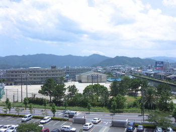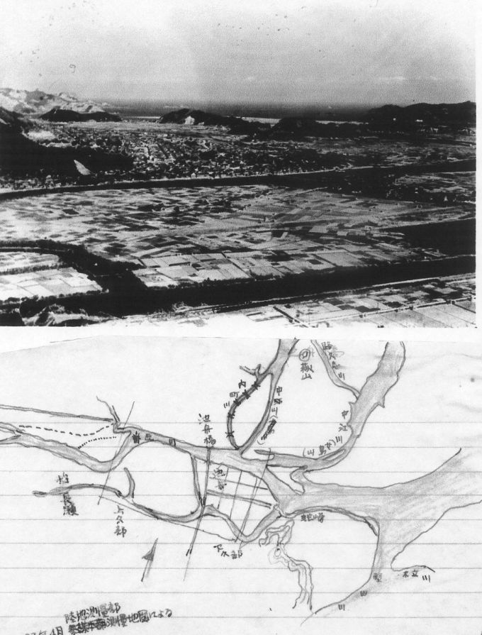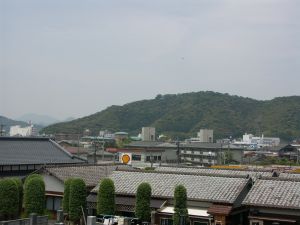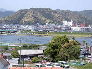 萩山より鶴屋城山并に城下を望む郡の主府にして毛利氏変世據る所なり商業頗る繁昌す郡役所、区裁判所、警察署、税務署、郵便電信局、銀行、寺院、学校等あり番匠川は西南を環流し大江灘川は其南に流る慶長六年毛利伊勢守高政氏の封せらるるや地を鶴屋に相し居城を新築す山形鶴翼を張る如し故に鶴城と称す舊鶴を殺すを国禁とす依て白鶴丹項四時群を為すと |