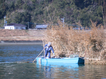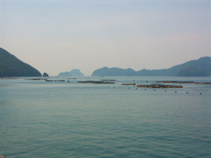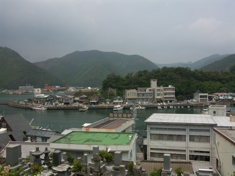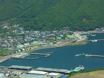 蒲江港湾 今のパノラマ本郡第二の都会漁魚の盛なるを以て名あり電信局の設けあり湾内能く風波を避け汽船を入るるに足る |