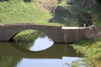 古市石塔鶴岡村古市に在り年代審ならず方四尺高さ二丈五尺余十三層方なり四面悉く彿像を刻す古色蒼然数百年前の物なるべし蓋佐伯惟冶以前の寺蹟少なからず古塔所在を道成寺と称す其上方に長雲寺光明寺の趾あり前面脇村の山上に一上寺二上寺山上寺の趾あり輪塔の残片を見る常時佛法の盛なるを知るべし 尺間神社 今のパノラマ大坂本尺間山上に在り養老元年六月二十四日神托に因て山城国愛宕神社の神霊を勧請成す 釣り橋 今のパノラマ因尾川の上流中野村に在り、明治三十一年の新設なり古来の難路頓に易行の道となる 彿座 今のパノラマ因尾道路に在り、因尾川に岩骨突出して道を塞ぐ、岩の間自ら空洞道をなす |
