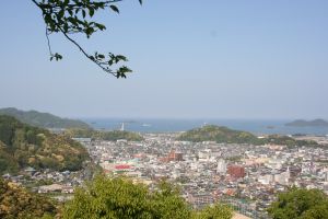 城山より佐伯湾を望む 今のパノラマ北蒲戸崎南鶴見崎遥かに相対して一大湾を作す佐伯湾是なり此間大島大入島屋島群島竹島双子島等大小無数の島嶼あり雄大の風景本州第一と称す |