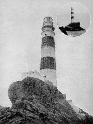 水の子灯台一に日振島と称す周囲三丁余りの小島にして梶寄村よら東北七里の海心にあり古は宇和島佐伯二藩の領境とす燈台は明治三十四年三月起工三十七年三月落成高十八丈余六萬八千八百燭光の旋転燈なり毎三十秒一閃白光を発し二十海里を照す工費弐拾萬円と云本邦第一の一等燈台たり |