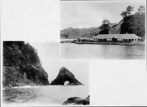 東雲尋常小学校 今のパノラマ上浦村浅海井村にあり 眼鏡岩 今のパノラマ名護屋村波当津に在り豊日二州の国境なり洞巌濶さ凡そ四間高さ亦同じ漁舟の往来する所奇景想ふべし (此二葉は佐伯町深津写真館の撮影に係る) |