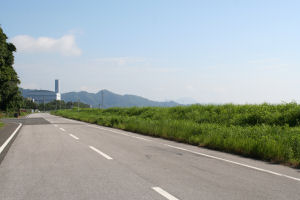 | 下の写真は東浜番匠川河口の道路ですが ここに松を植えたらどうなるか パソコンを使って松並木を合成してみました 写真をクリックしてそのパノラマをご覧ください |
