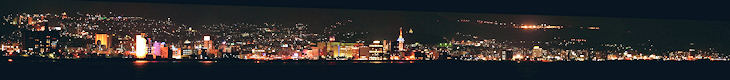 別府は坂の町です、山側から海に向かって斜面にできた町です。 別府市は古くから今の関西汽船の前身の大坂商船の船で瀬戸内海航路で海上から観光客を 迎えていました。 このページでは別大国道(国道10号線の別府━大分間)からの別府の眺めなどを パノラマ写真にしてみました。