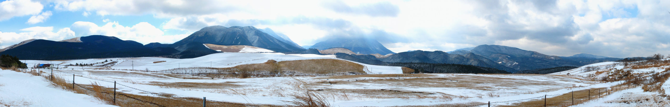 2010年1月14日 前日の雪で高原は雪景色 由布岳(中央の高い山)は頂上が雲に隠れています。