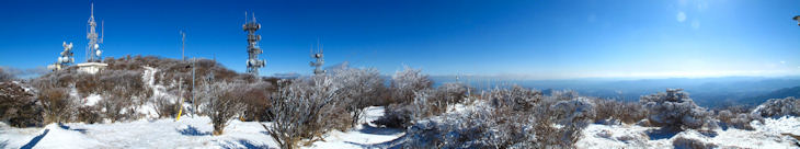 真冬の山頂では氷点下5度以下で霧が木々に凍りついて出来る霧氷を見る事ができます
