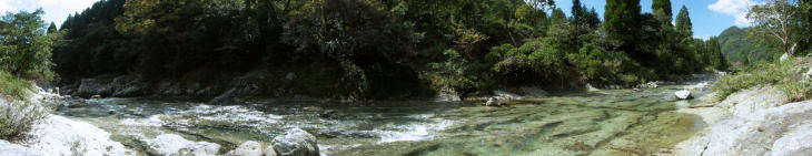 旧山国町のパノラマ風景です。 猿飛千壷峡の甌穴群は山国川の清流が長い年月をかけ安山岩を削り大小様々な 丸い穴をあけていて面白い眺めです。 その下流には魔林峡といわれる景勝地です。コアやまくにはガラス張りのタウンホール スケートリンク・図書室など備えた複合文化施設で近くには建築年がはっきり分かっている 九州最古の木造家屋神尾家住宅もあります。