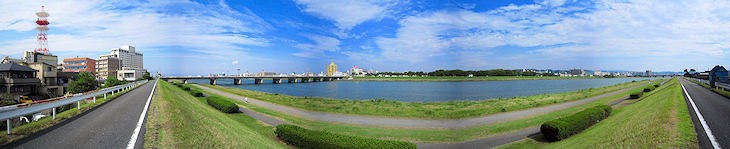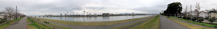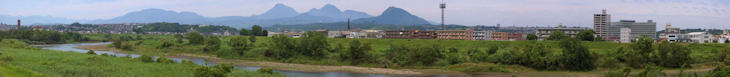 大分県中部を流れる大分川と周辺の大分市内でのパノラマ写真です。