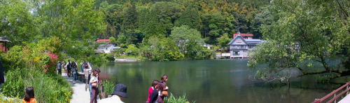 金鱗湖は由布院(湯布院)を代表する観光スポットです。 明治初期の儒学者「毛利空桑」が、湖で泳ぐ鯉の鱗が夕日で金色に輝いて見えたことから 金鱗湖と名づけたそうです。 湖底の一部からは温泉と水が湧き出している周囲約400mの小さな湖です。